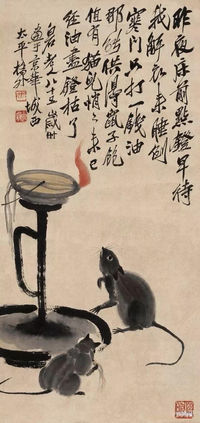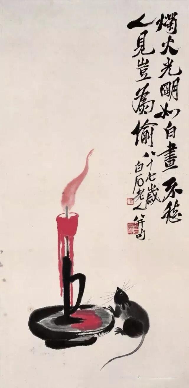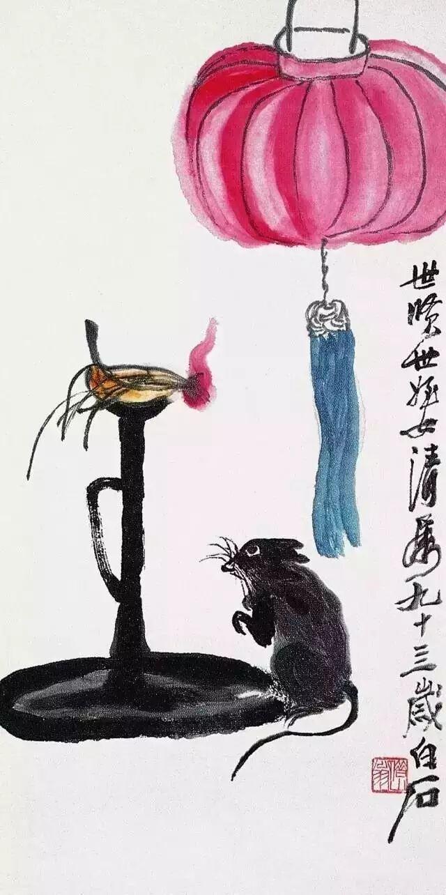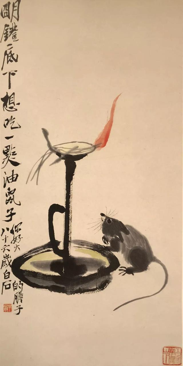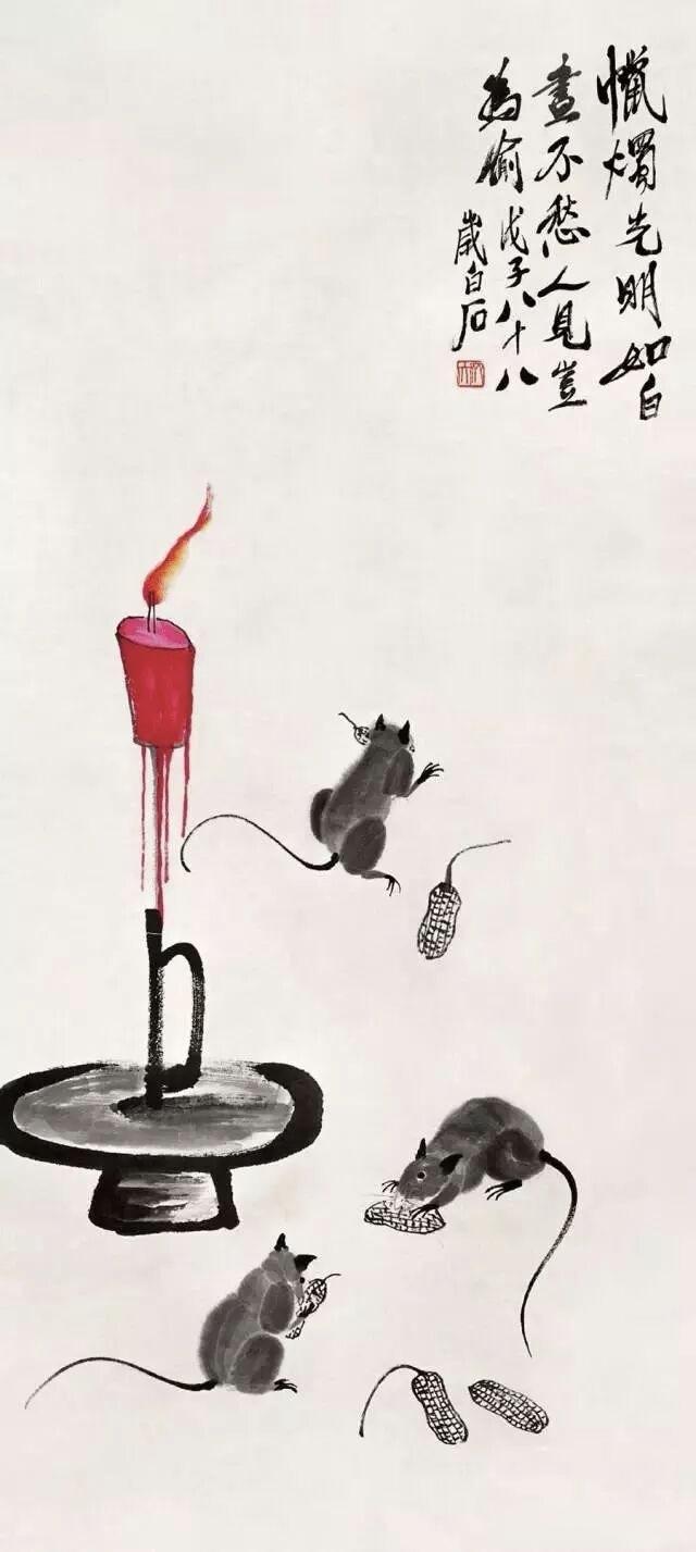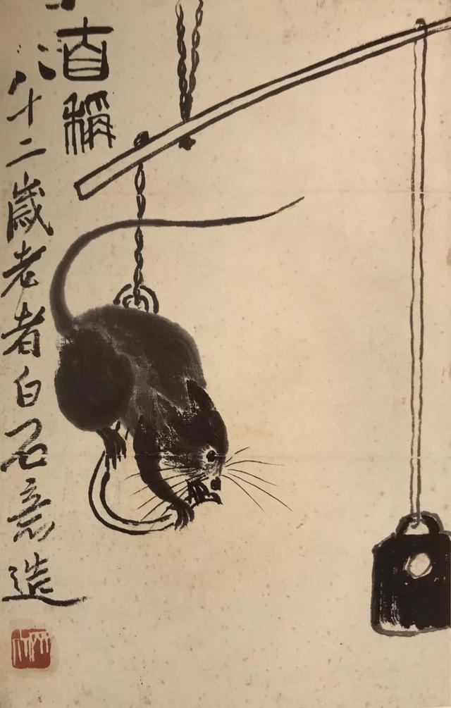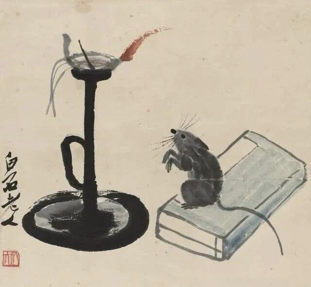 九十多岁时,他还在画老鼠。那时他早已名满天下,一幅画价值连城,可他笔下的老鼠,还是那股子乡野气——蹲在灯台上偷油,躲在稻穗下偷米,趴在秤钩上自称。