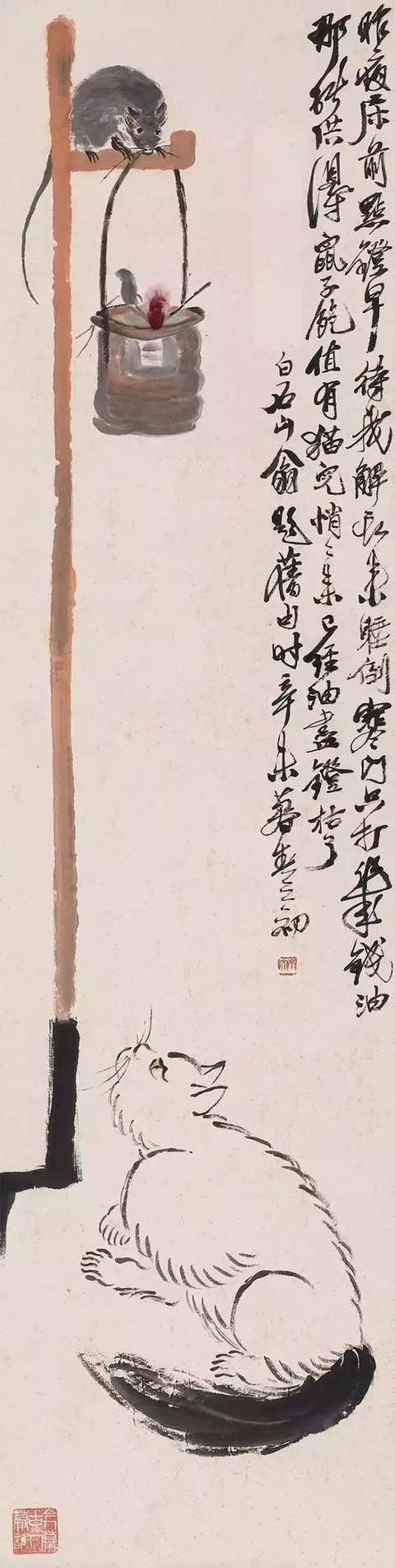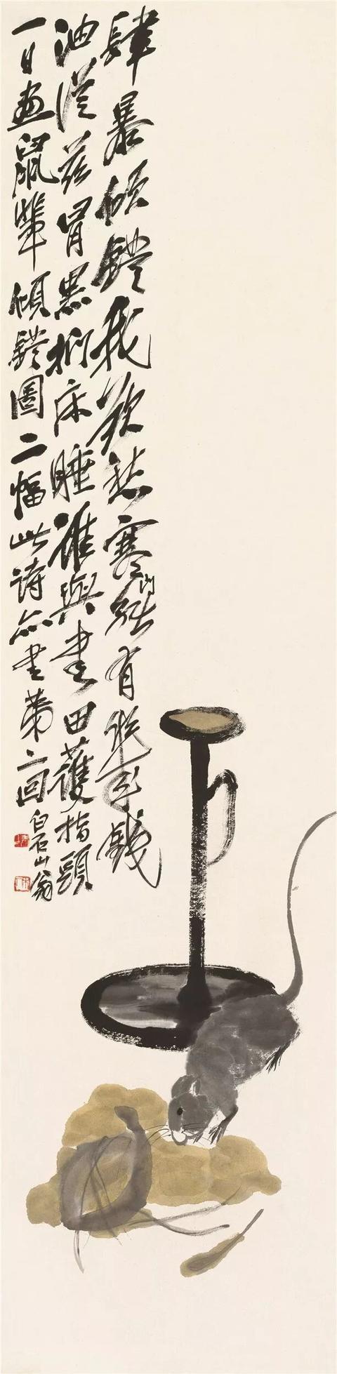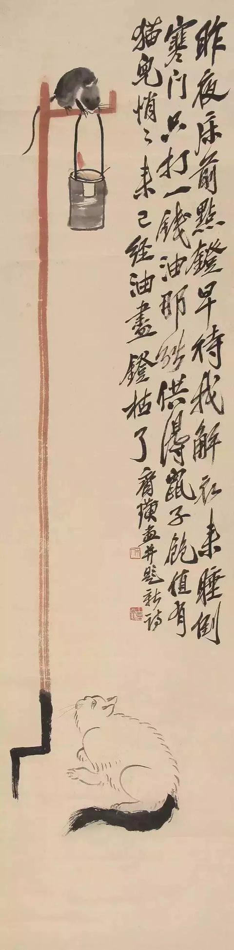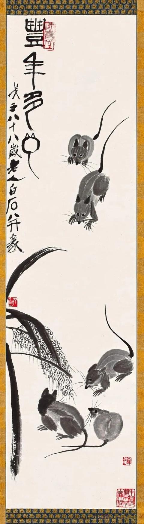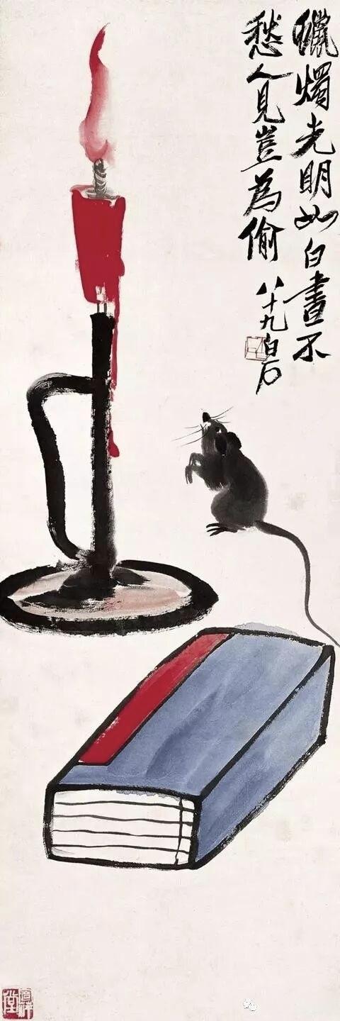 九十多岁时,他还在画老鼠。那时他早已名满天下,一幅画价值连城,可他笔下的老鼠,还是那股子乡野气——蹲在灯台上偷油,躲在稻穗下偷米,趴在秤钩上自称。