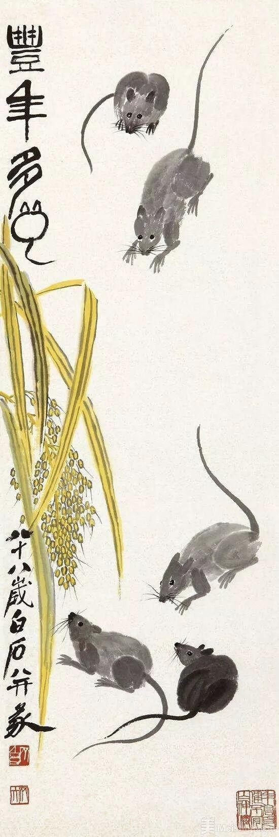 2011年,北京翰海拍卖会上,齐白石的一幅《丰年多鼠图》拍出了1092万元的天价。