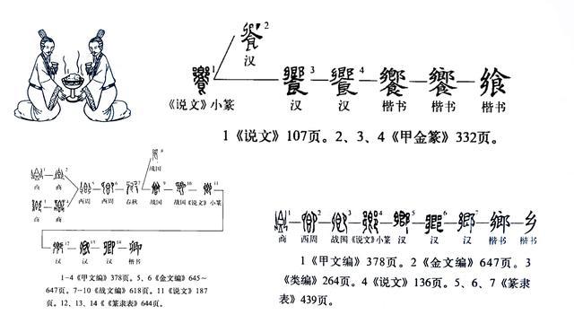 罗振玉《增订殷虚书契考释》:“皆象饗食时宾主饗向之状,即饗字也。古公卿之‘卿’,乡党之’乡’,饗食之‘饗’,皆为一字,后世析而为三。……‘饗’入《食部》,而初形初谊不可见矣。”来看一下三个字的字形演变: